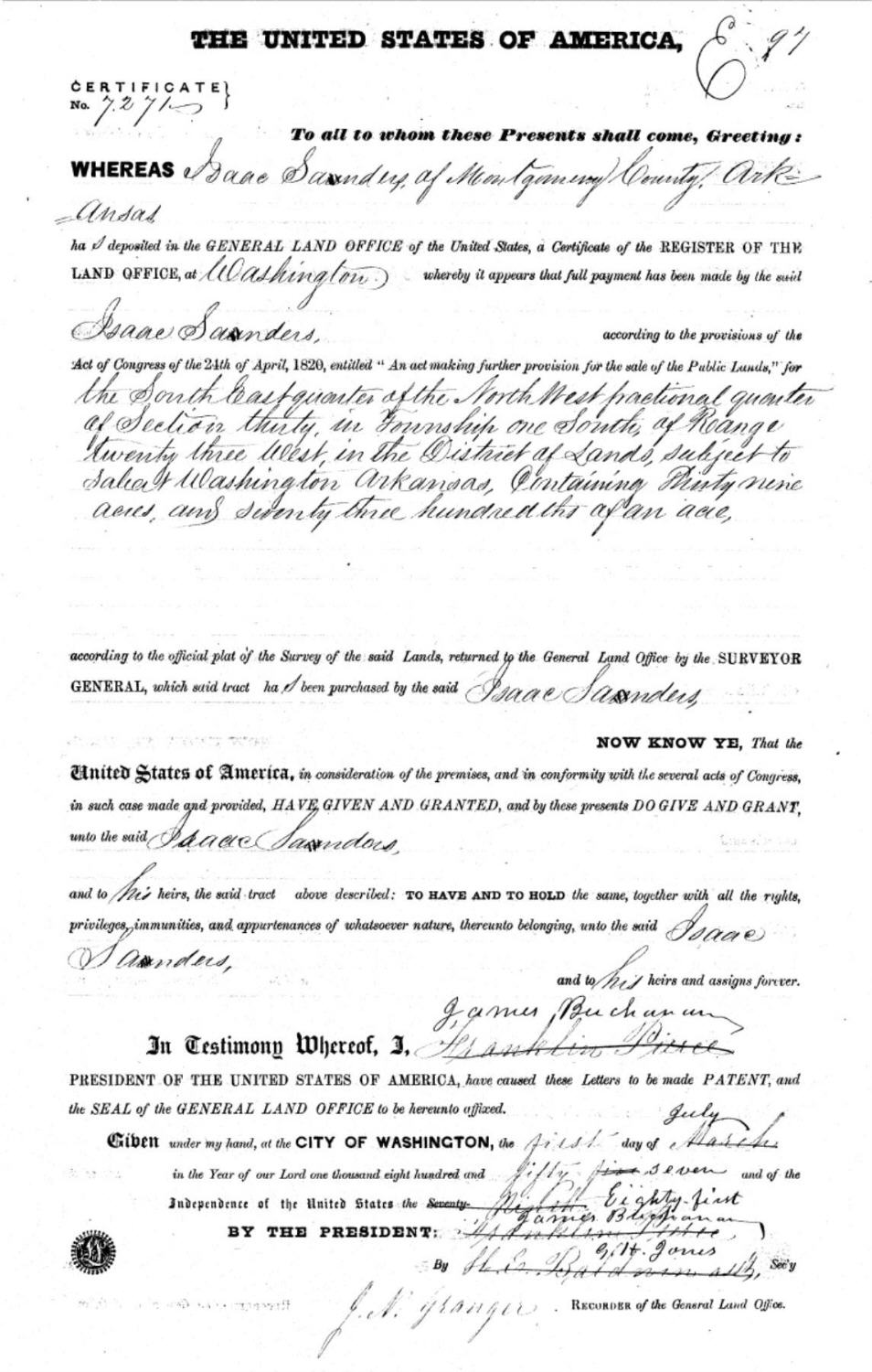 In 1772, William Aaron received a land grant on Barnes Creek in what is now Montgomery County. Between 1771 and 1774, Moses Sanders received several grants of land in present day Montgomery County (then Anson County), to the west of Aaron's land. In 1774 Moses and Aaron were ordered to help construct a road. In 1782 Isaac appears on the tax roll of Montgomery County. These are typical of the numerous references to Moses, Aaron, or Isaac in the land records.